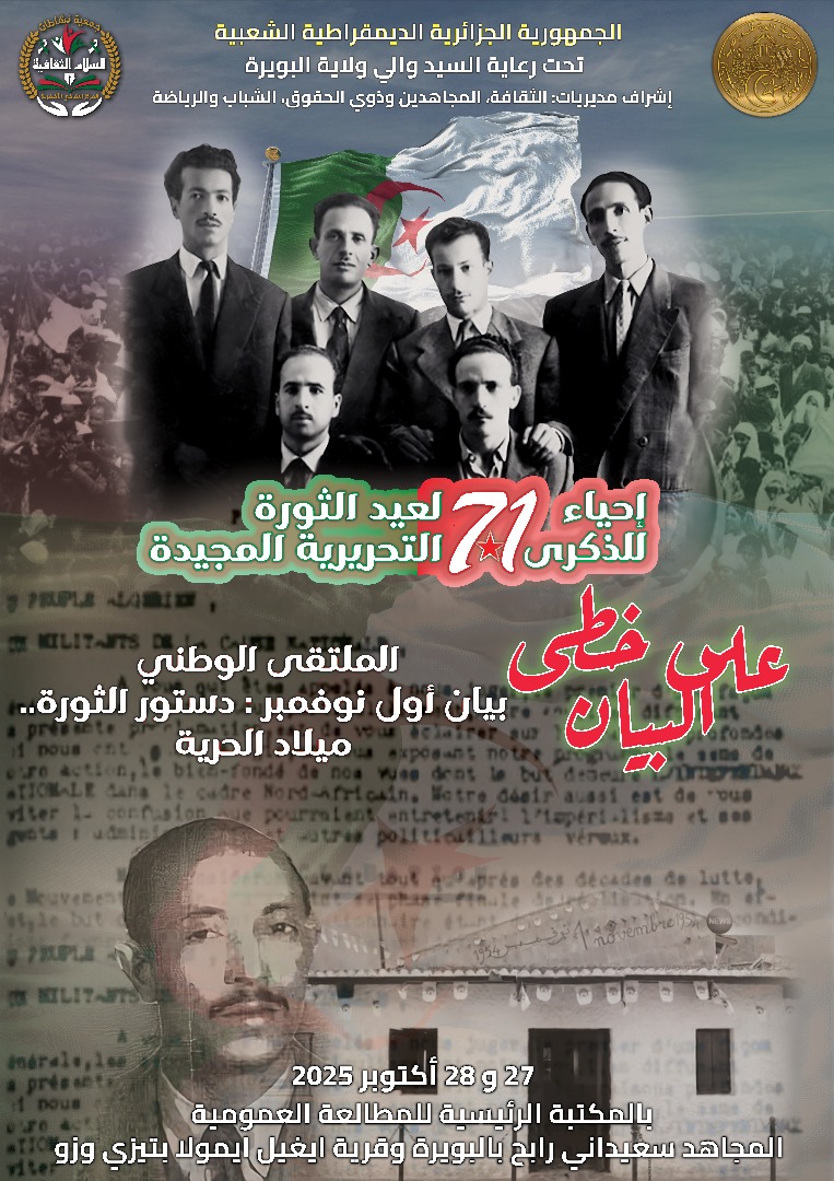 تحتضن ولايتا البويرة وتيزي وزو يومي 27 و28 أكتوبر الجاري فعاليات ملتقى وطني تاريخي موسوم بعنوان “البيان الخالد.. دستور الثورة وميلاد الحرية”، تخليدًا للذكرى الـ71 لاندلاع ثورة أول نوفمبر المجيدة، وتسليطًا للضوء على البيان التاريخي الذي أسّس لمسيرة التحرر الوطني.