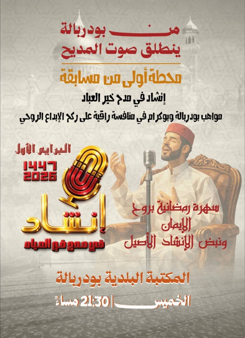 تستضيف بلدية بودربالة بولاية البويرة، الخميس المقبل، أولى محطات مسابقة ” إنشاد في مدح خير العباد”، في إطار البرنامج الولائي الذي أطلقته جمعية نشاطات السلام الثقافية و المركز الثقافي “رخوان عيسى” بالأخضرية، بالتنسيق دار الثقافة علي زعموم بالبويرة وديوان مؤسسات الشباب بإشراف مديريتي الثقافة والفنون، والشباب والرياضة، لإحياء السهرات الرمضانية بفن المديح والإنشاد الديني.