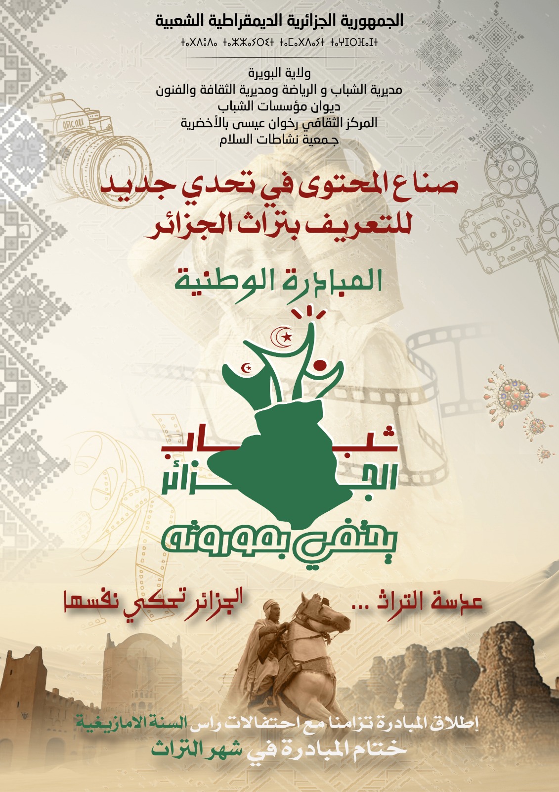 أطلقت جمعية نشاطات السلام الثقافية مبادرة وطنية شبابية بعنوان “شباب الجزائر يحتفي بموروثه”، بالتنسيق مع المركز الثقافي رخوان عيسى بمدينة الأخضرية، وبتأطير من ديوان مؤسسات الشباب لولاية البويرة، وتحت إشراف مديريتي الثقافة وكذا الشباب والرياضة لولاية البويرة، وذلك في إطار مشروع ثقافي رقمي يحمل شعار “عدسة التراث… الجزائر تحكي نفسها”، ويهدف إلى تثمين التراث الجزائري المادي واللامادي، وجعل الإبداع الرقمي وسيلة عصرية للتعريف به والترويج له على نطاق وطني واسع.