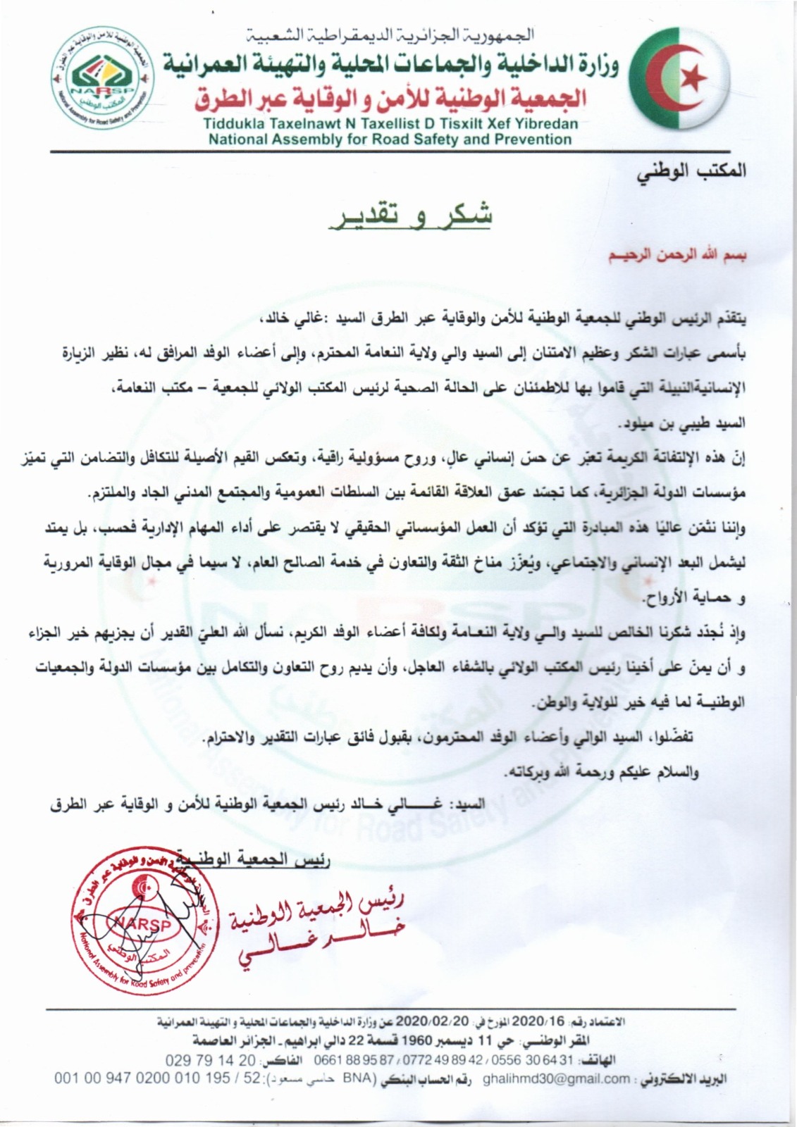 يتقدّم الرئيس الوطني للجمعية الوطنية للأمن والوقاية عبر الطرق،