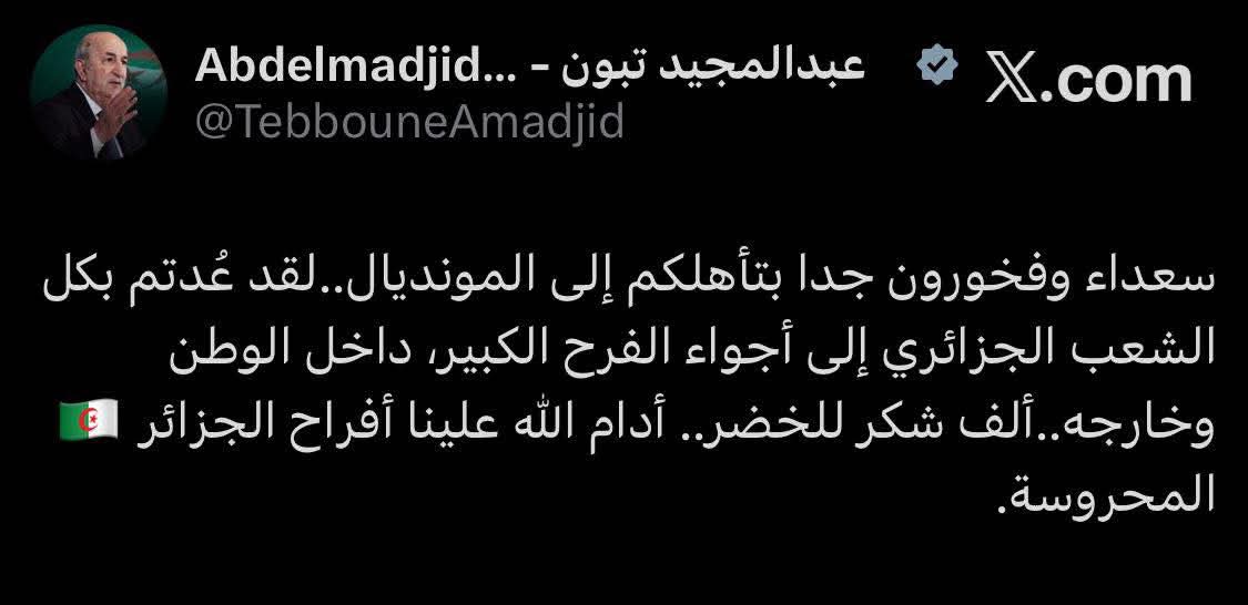«نحن سعداء وفخورون بتأهلكم إلى المونديال. لقد أعدتم إلى قلوب كل الجزائريين، في الداخل والخارج، نكهة الأفراح الكبرى. ألف شكر لمحاربي الصحراء. حفظ الله هذه اللحظات السعيدة للجزائر، الحصن المنيع».