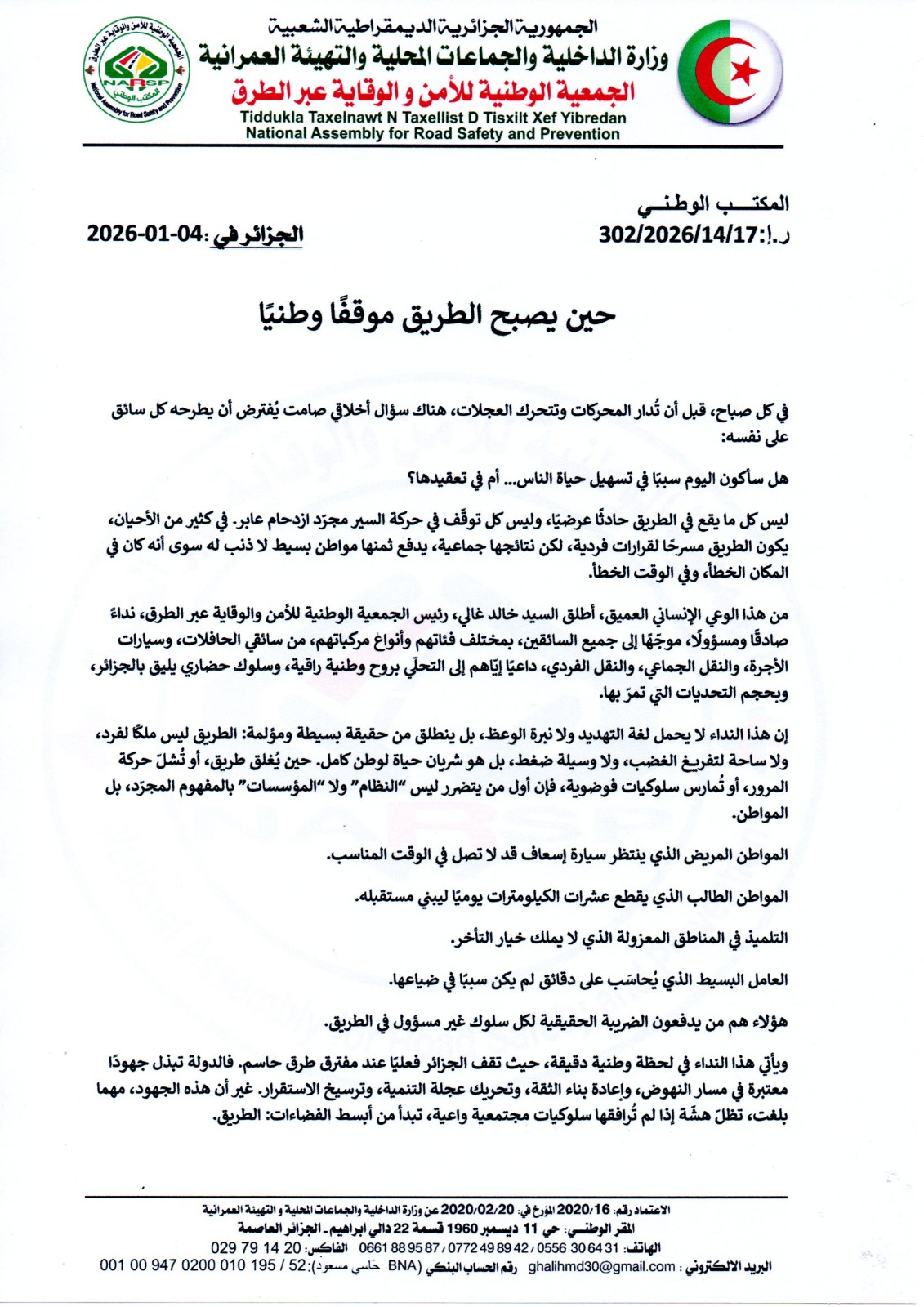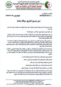 إن النداء الذي يرفعه رئيس الجمعية الوطنية للأمن والوقاية عبر الطرق هو دعوة صريحة إلى تجديد العقد الأخلاقي بين المواطن والطريق، عقد يقوم على الوعي، والاحترام، والإحساس بأن الجزائر لا تُبنى فقط بالقرارات والسياسات، بل أيضًا بسلوك أبنائها في تفاصيل حياتهم اليومية.