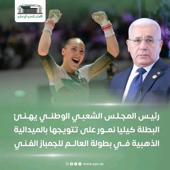 > “أهنئ بكل فخر البطلة كيليا نمور على إحرازها الميدالية الذهبية في جهاز المتوازي مختلف الارتفاعات ضمن منافسات بطولة العالم للجمباز الفني 2025 بجاكرتا. إنجاز مشرّف يرفع راية الجزائر عاليًا ويؤكد تألق رياضتنا النسوية في المحافل الدولية.”