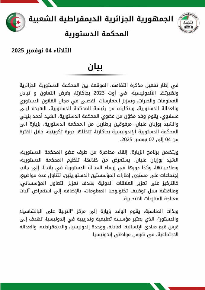 وخلال الزيارة، يطّلع الوفد على التجربة الإندونيسية في نظر المنازعات ذات البعد الانتخابي، وآليات إدارة الجلسات العلنية، ونظم التتبع الإلكتروني للملفات، إضافة إلى منظومة الأرشفة الرقمية وحفظ السوابق القضائية. وفي المقابل، يعرض الوفد ملامح التجربة الوطنية في الرقابة الدستورية على القوانين بحسب الإطار الدستوري والقانوني المعمول به، وتقنيات المقارنة القضائية واستثمار الاجتهادات اللاحقة والسوابق ذات الصلة.