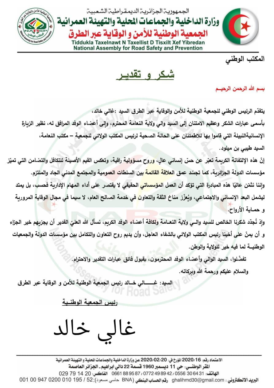 بأسمى عبارات الشكر وعظيم الامتنان إلى السيد والي ولاية النعامة المحترم، وإلى أعضاء الوفد المرافق له، نظير الزيارة الإنسانية النبيلة التي قاموا بها للاطمئنان على الحالة الصحية للأمين الولائي للجمعية – مكتب النعامة، السيد طيبي بن ميلود.