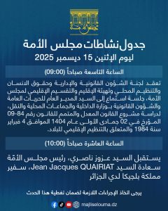 برمج مجلس الأمة، اليوم الاثنين، جملة من النشاطات التشريعية والدبلوماسية الهامة، في إطار مواصلة أداء مهامه الدستورية وتعزيز علاقاته المؤسساتية على المستويين الوطني والدولي.