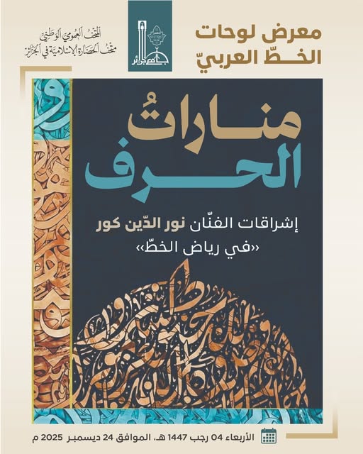 يحتضن متحف الحضارة الإسلامية بجامع الجزائر، اليوم الأربعاء 24 ديسمبر 2025، معرضاً فنياً متميزاً للخط العربي بعنوان “مناراتُ الحرف.. إشراقات الفنان نور الدين كور”، وذلك تحت شعار “في رياض الخط”.