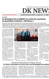 في سياق يتسم بتعاظم التحديات المرتبطة بحوادث المرور، وبالتوازي مع دخول قانون المرور الجديد حيّز المصادقة، برز لقاء بن عكنون كإشارة ذات دلالة عميقة على تحوّل نوعي في مقاربة أمن الطرقات في الجزائر. فقد استقبل مساء أمس المدير العام ليومية ديكا نيوز DK News السيد بن زين بمقر الجريدة ببن عكنون، رئيس الجمعية الوطنية لأمن الطرقات السيد خالد غالي مرفوقًا بنائبه، السسد سعيد وعضو المكتب الوطني المكلفة بالطفولة ذوي الاحتياجات الخاصة ضحايا حوادث المرور السيدة نبيلة عوفي، إلى جانب مراسل دزاير نيوز السيد مفتاحي عبد الكريم  في جلسة حوار جمعت بين الإعلام، المجتمع المدني، والبعد الإنساني للقضية المرورية.