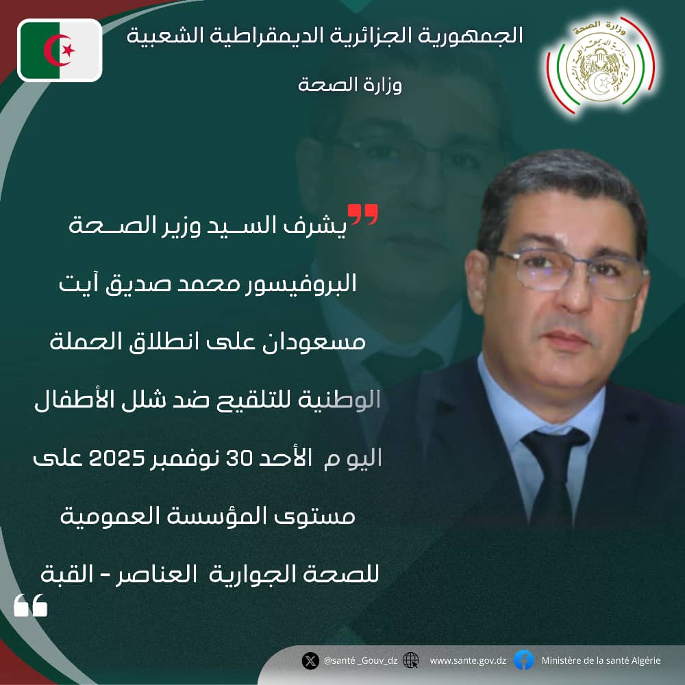 في إطار تعزيز منظومة الوقاية الصحية وحماية الطفولة، تنطلق يوم غد الأحد 30 نوفمبر 2025 الحملة الوطنية للتلقيح ضد شلل الأطفال عبر كامل التراب الوطني، تحت إشراف السيد وزير الصحة، البروفيسور محمد صديق آيت، وذلك على مستوى المؤسسة العمومية للصحة الجوارية العناصر – القبة، على الساعة التاسعة والنصف صباحًا (09:30).